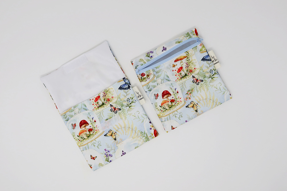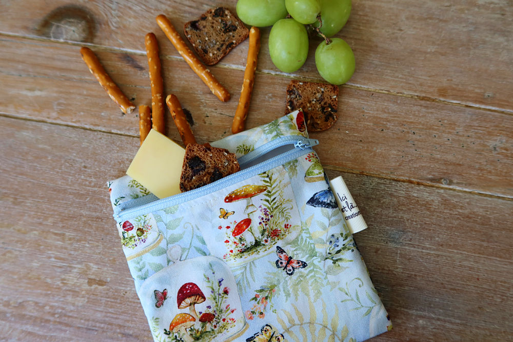 A small bag with a zipper or Velcro.  Ideal for holding a snack or a sandwich.  The inner fabric is a PUL food-safe material which is fruit and vegetable friendly!  What’s more, it’s waterproof!  No health risks!